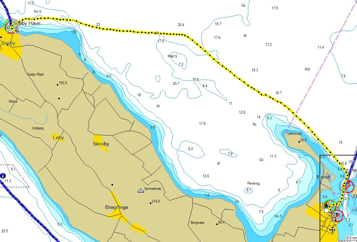 Vlak voordat wij het geultje naar Aeroskobing in wilden varen zagen wij er een veerboot vandaag komen. Maar even wat gas teruggenomen, zodat deze er eerst uit kon komen.