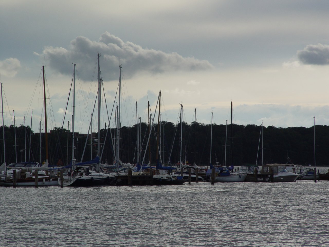 In de haven aangekomen zijn wij weer op zoek gegaan naar een passende box. Hier was gelukkig meer keus, want het is een zeer royale haven. Ons blik viel op een box aan de buitenkant van de steiger. Niet helemaal zeker of de box wel past, varen wij heel rustig tussen de stevige meerpalen door de box in. Maar.... je raad het al, muurvats tussen de twee te stevige palen die niets meegeven. terug, achteruit is dan de enige optie. Maar ondanks dat wij rustig naar binnen gingen, leken wij muurvast te zitten tussen de palen. Geen probleem dacht ik, wie niet sterk is moet slim zijn. Dus snel even een paar lijnen om de meerpalen en over beide lieren, dan zijn wij zo weer los. Ja, dat is natuurlijk wel zo, als je de juiste kant op trekt en niet zoals snuggerige ik deed, nog vaster tussen de palen trekken. Nou ja, Hettie kwam er net op tijd achter, zodat wij ons alsnog op handkracht uit de box wisten te murwen. Voor de tweede keer geldt: wie niet sterk is moet slim zijn, dus zijn wij vanaf de zijkant de box in gevaren (en dat ging in een keer goed!)