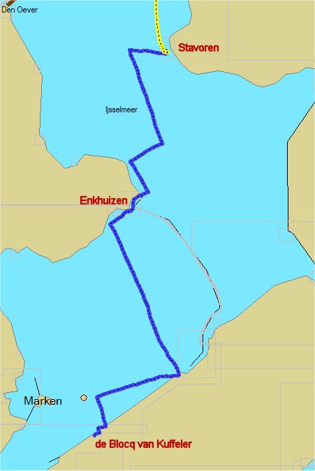 Er staat wat minder wind dan gisteren, maar het giert nog steeds tussen de masten door. De verwachting is ZZW 4-5, dat betekent dus alles opkruizen: Enkhuizen is ZZW tov Stavoren en de Blocq van Kuffelere is ZZW tov Enkhuizen! Het mooist zou het zijn als we de high aspect gebruiken, maar daar zitten nog steeds twee schueren in. Na wat overleg hebben wij besloten de high apsect te repareren en kijken of dat lukt. Zo gezegd zo gedaan.