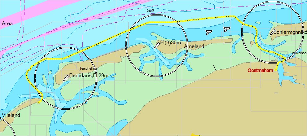 Vlak voordat wij Terschelling voorbij zouden lopen kwam er gelukkig toch nog wat wind, zodat wij het laatste gedeelte van de reis nog even lekker hebben kunnen zeilen. Met de gennaker hebben wij het voordewindse rakje nog wat aantrekkelijk kunnen maken door deze wat af te kruizen, maar de halfwinder bleef er wel wat onrustig onder. Uiteindelijk de fok er maar bij zetten en de halfwinder naar beneden gehaald, De fokkeval stond wat slap dus deze maar wat aangehaald. Met een klap kwam de fok echter naar beneden zetten en kwam uiteraard in het water terecht. Deze snel naar binnen gehaald en verder op alleen het grootzeil. Deze ondieptes voor Vleiland zorgen ervoor dat je een behoorlijk eind om moet varen. Heel voorzichtig hebben wij dit een beetje afgesneden. Met opkomend water kun je dit nog wel veroorloven. Minder dan 1,3 meter water hebben wij niet onder de kiel gehad.