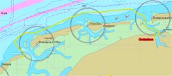 Tijdens de aankomst 2 dagen geleden was al duidelijk geowrden dat een actuele kaart minder hulp biedt dan de tonnen, dus was het ook nu weer zaak de tonnen te volgen om het gaatje naar de westkant te vinden. Op de 2008 kaart stond deze geul nog aangegeven met gele midvaarwatertonnetjes, nu bleken er gewoon rode en groene tonnen te liggen en was het niet moeilijk dit gaatje te vinden.